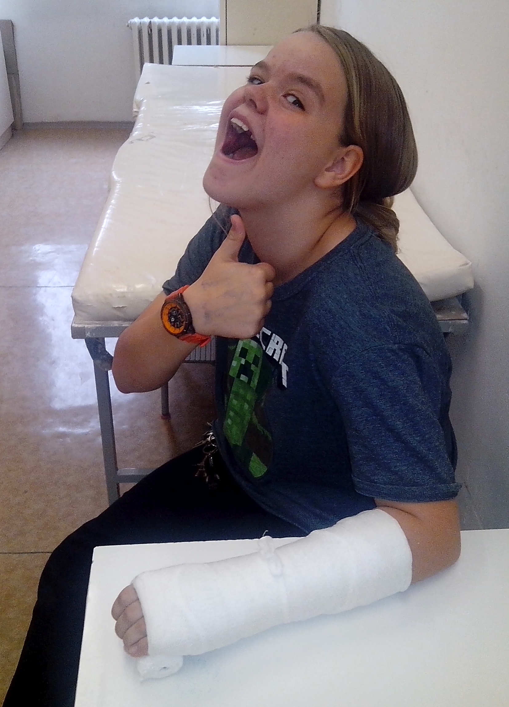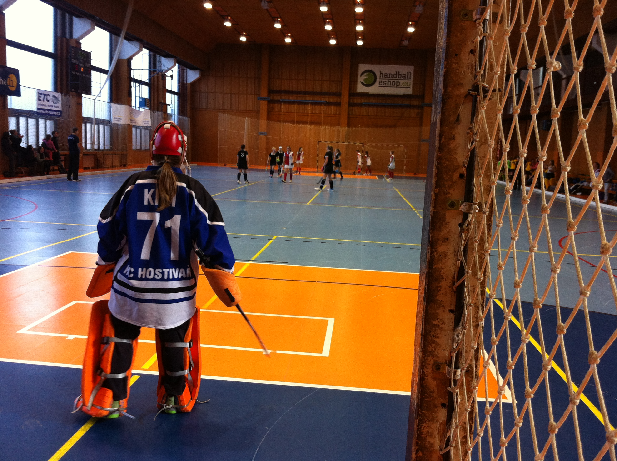 Chytám s brankářskou hokejkou od TK. Je sice trochu křehčí, takže už je trochu omlácená, ale ani velké rány přes ní moc nebolí. Je sice trošku kratší než normální brankářské hokejky, ale ještě jsem nenašla nic, při čem by mi to vadilo. Vlastně se to ke mně i trochu hodí, já jsem taky trošku kratší (smích).