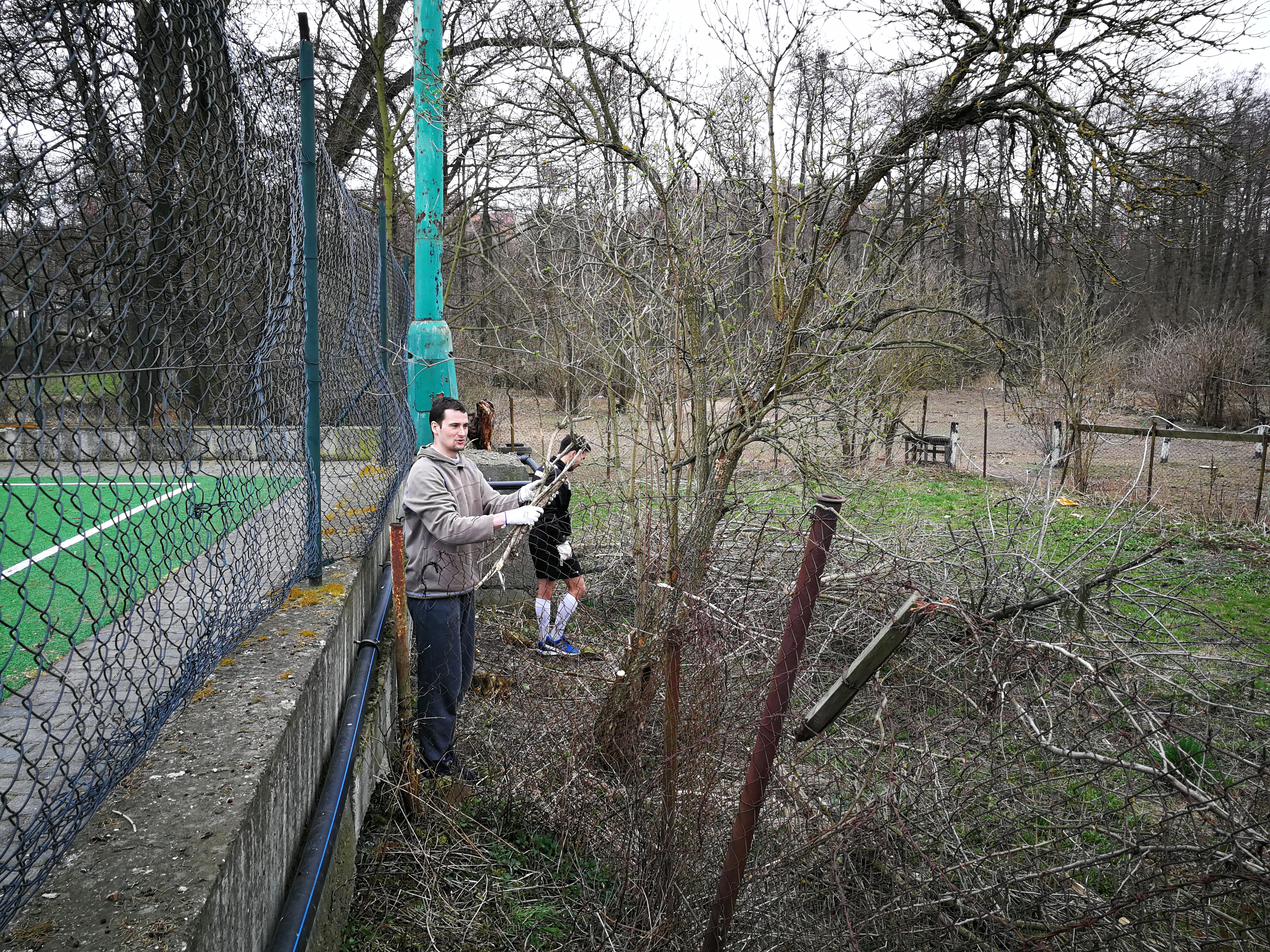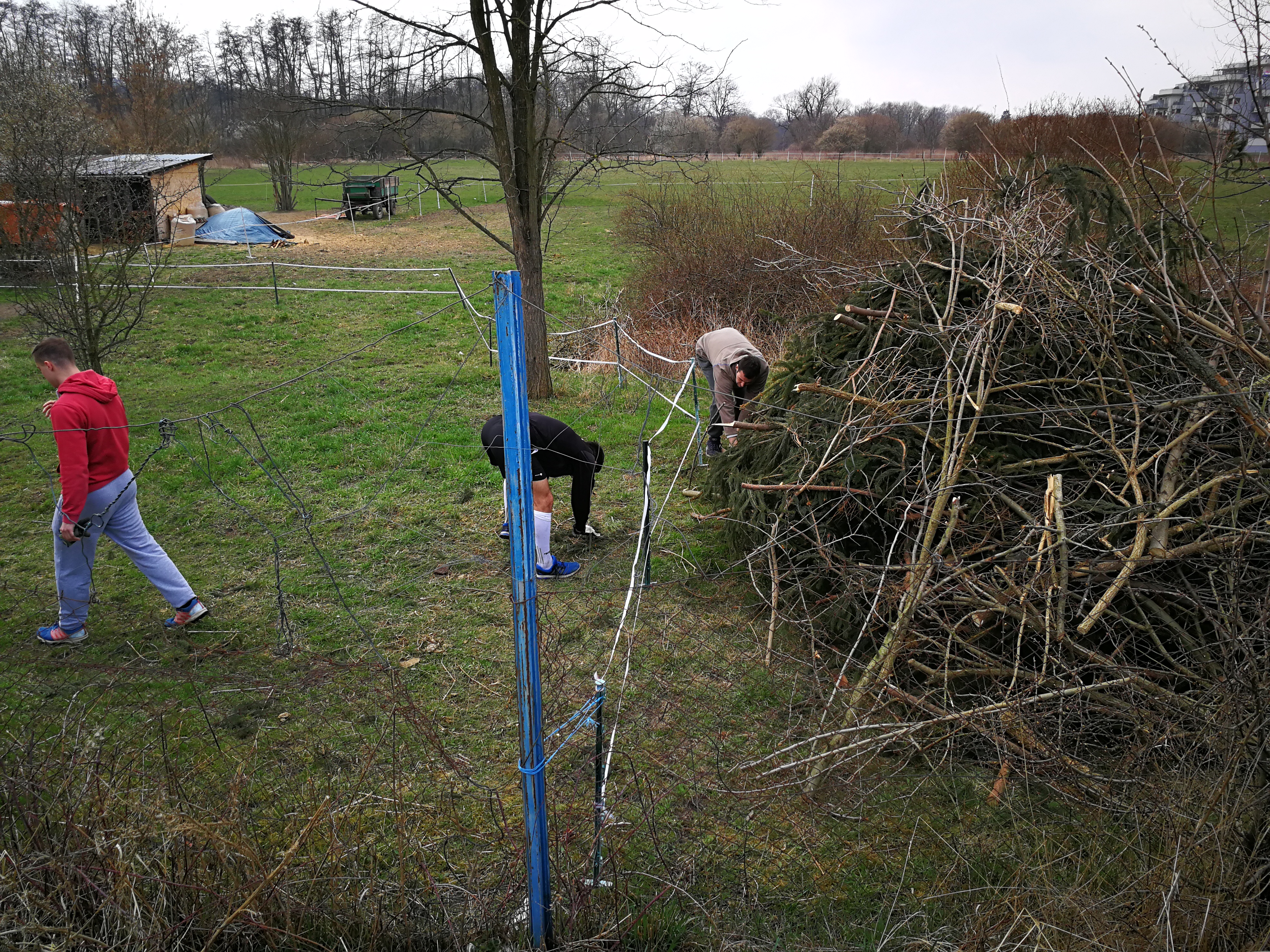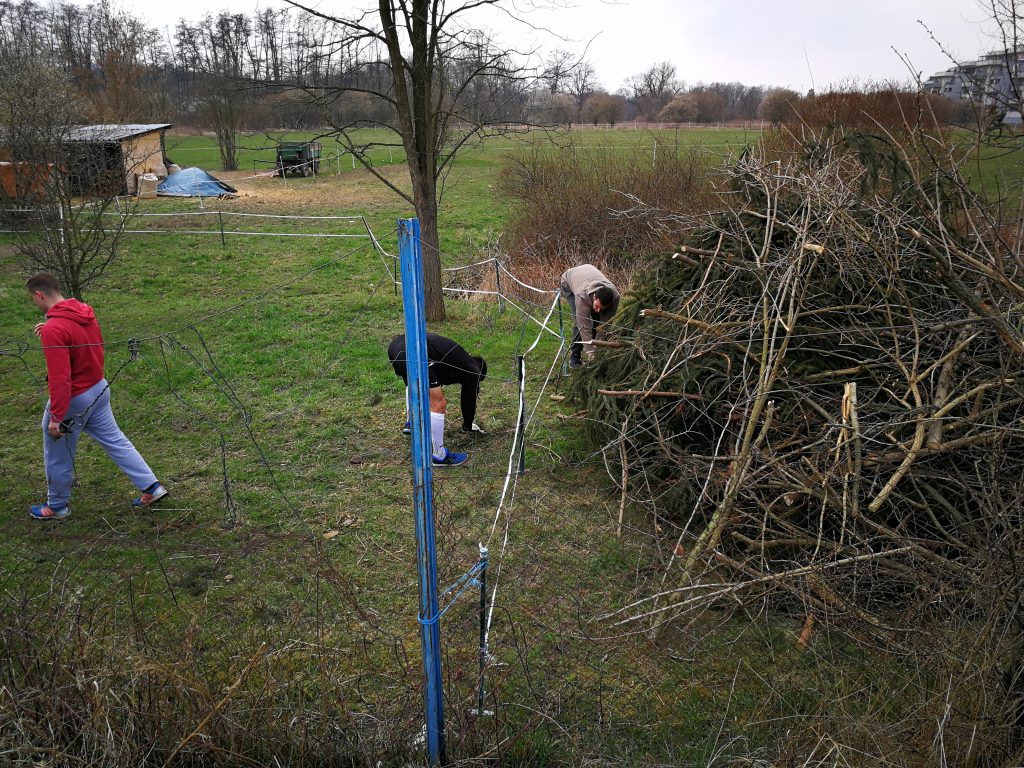 Tedy, podařilo vyčistit od náletů zadní část plotu u zoo-koutku, kde nálety tvořili velmi nebezpečné místo, dále se odnosilo metrové dřevo po poražených stromech (smrk – nálet), do přední části areálu na odvoz. Prostor se dále vyčistil od větví. Dále bylo prostor kolem buněk – „šaten“ vyčištěn a nashromážděný odpadový materiál připraven k odvozu. Jako zdařilý kousek se našim borcům povedlo vybudovat nové ohniště. Za spontánní nápad je třeba poděkovat Janu Pauerovi.