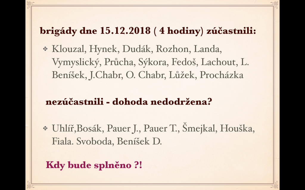 Omluveni: Holub, Lůžek, Bosák, Beníšek L., Šmejkal, Trávníček, Dudák