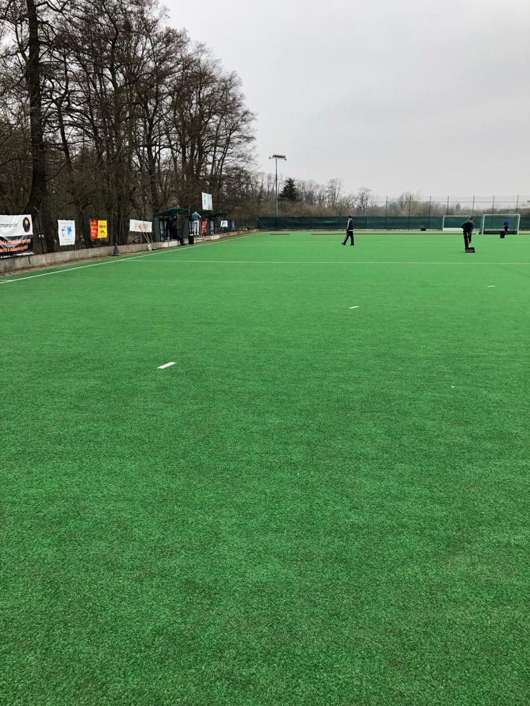 Na záběru zjevně vyčištěné hřiště při rozehřátí.