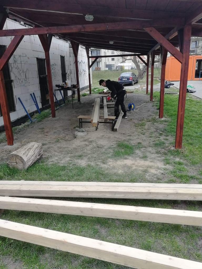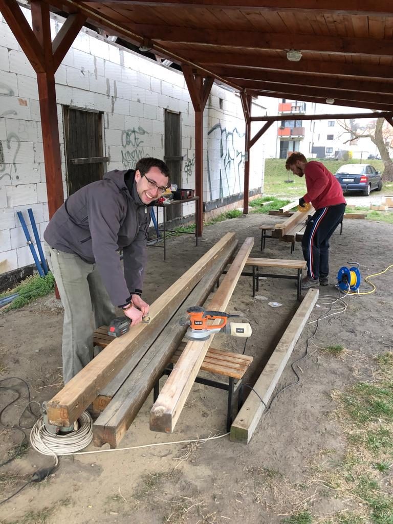 Bylo také třeba obrousit mantinely z malého hřiště. Vše se nestihlo. Při práci Jakub Šmejkal a Honza Pauer. Kluci také děkují za půjčení profesionálních nástrojů Jirkovi Novotnému.