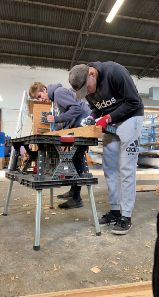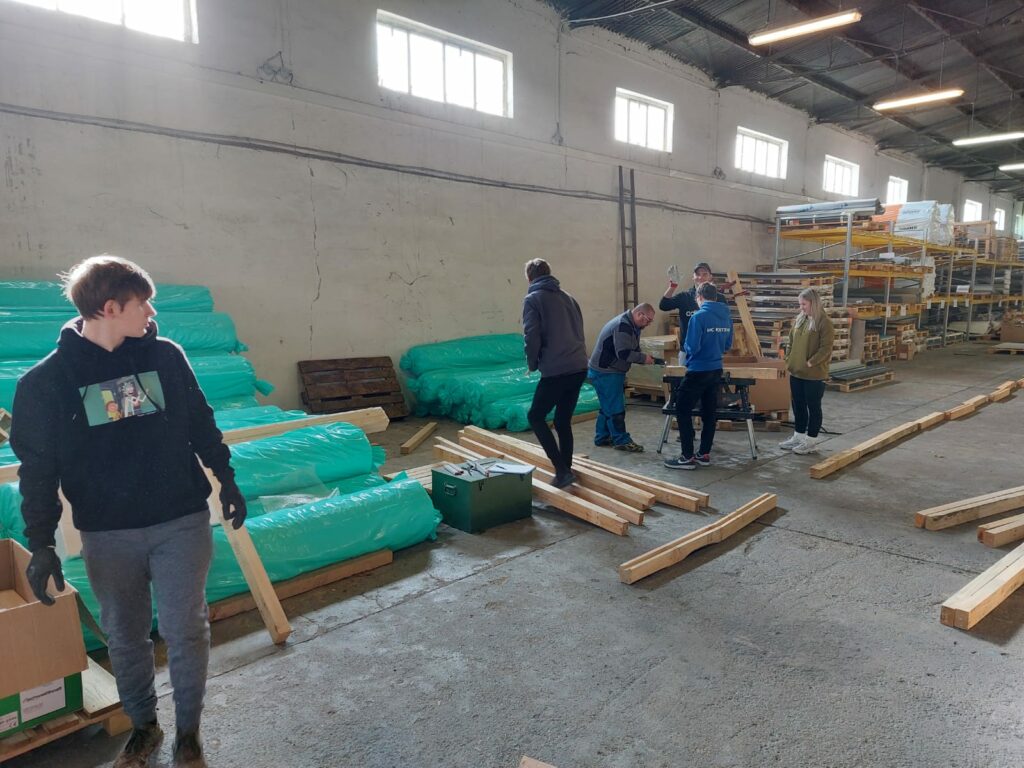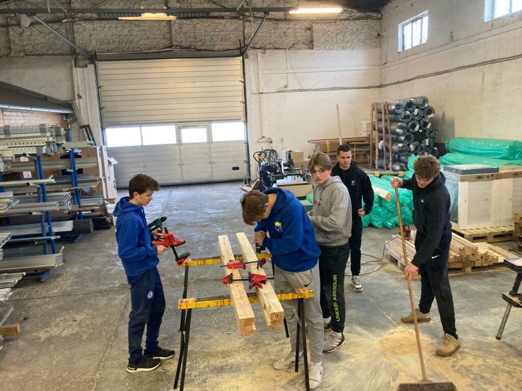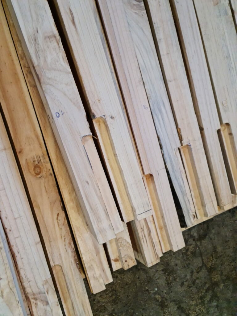 Nutné bylo vybouchat trámky z použitých palet, následně z nich vybrat kovové předměty v podobě spon a hřebíků. Dané dřevo se pak zbrousilo a ohoblovalo. Aby byl jeden mantinel použitelný, museli jsme sešroubovat dva trámky k sobě, zejména kvůli pevné a stabilní konstrukci mantinelu. Následně do nich vyhloubit prostor pro spojnice tak, aby mantinely držely u sebe až se položí do haly.