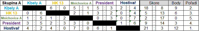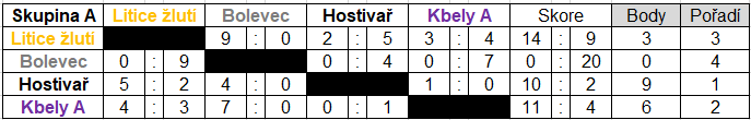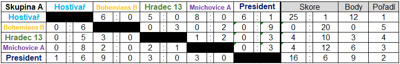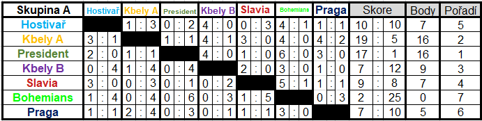 Konečné pořadí: 1. Kbely A, 2. Hostivař, 3. Kbely B, 4. President, 5. Litice žlutí, 6. Rakovník, 7. Bolevec, 8. Litice modří