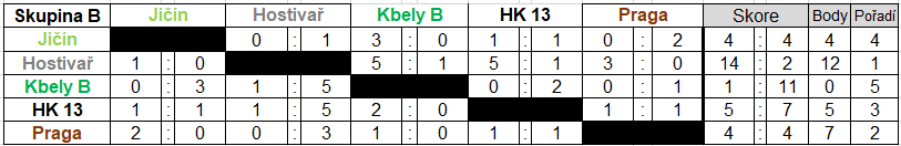 Konečné pořadí: 1. HK 12, 2. Hostivař, 3. Kbely A, 4. Praga, 5. President, 6. HK 13, 7. Jičín, 8. Slavia K, 9. Mnichovice, 10. Kbely B