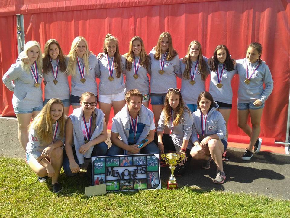 Zlaté dorky! (z levého horního rohu: Michaela Krausová, Lucie Šanková, Adéla Jelenová, Adéla Kožíšková, Anna Grieblová, Dominika Kasnerová, Kristýna Šafaříková, Zuzana a Monika Halamovi, Táňa Prosová, trenéři Lucka Andrášková a Libor Hlaváč, Iveta Ivanovová a Anna Jordánová)